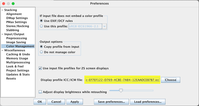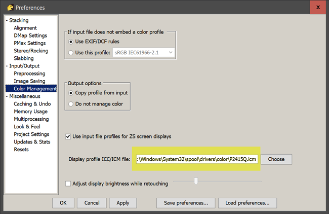 - Run Zerene Stacker, go to Options > Preferences > Color Management, and enter the path to that file at > “Display profile ICC/ICM file”.