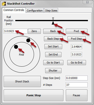 - A graphical user interface that allows a USB-enabled StackShot to be controlled from within Zerene Stacker. This interface mimics the coarse- and fine-focus controls of a microscope, as well as providing traditional forward/backward buttons. It provides finer control over rail movements than is provided by the stand-alone StackShot controller.