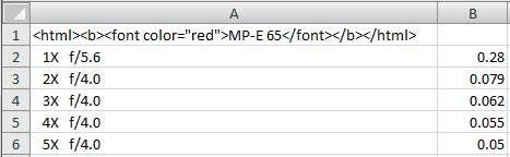 Note that the description field can be entered either as plain text or as HTML-formatted text. Here we have used HTML formatting codes to make “MP-E 65” print in bold and red. This sort of formatting is useful to organize the table when many setups are provided.