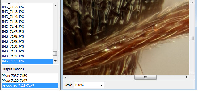 The better way is to use “Stack Selected” to generate stacked output for just those input frames that have the antenna in focus, then retouch using the Stack Selected output as a source for brushing. That way we get to retouch from just one image using a big brush, instead of having to paint small details from each of the twenty or so source images that have different parts of the antenna in sharp focus.