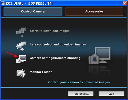 - If Canon EOS Utility opens into the Main Window, then select the Camera Settings / Remote Shooting option to bring up the camera controls window.