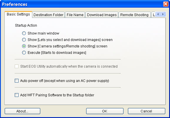 - In the camera controls window, press the Preferences button. In the preferences window select the Destination Folder tab and either set an appropriate location or at least make sure you know the current location. In the Basic Settings tab, you can also request that Canon EOS Utility start up showing the Camera Settings / Remote Shooting window, and whether to start EOS Utility automatically when the camera is connected and powered on.