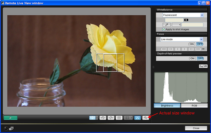 - Press “Remote Live View Shooting” button in Canon EOS Utility. The current Live View image will be displayed on the computer screen.