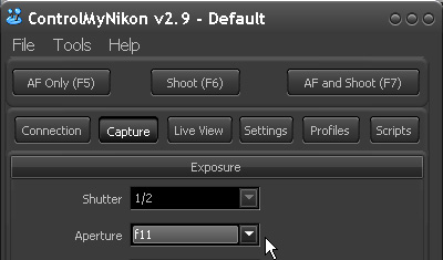 - With our Nikon D5000, the button labeled Shoot (F6) actually performs an auto-focus and shoot, apparently just like AF and Shoot (F7). To shoot without autofocusing, we have to go to Scripts, select the one for shooting without autofocus, then execute that script.