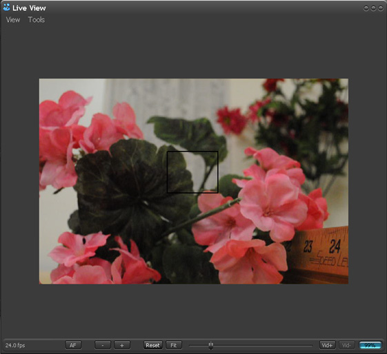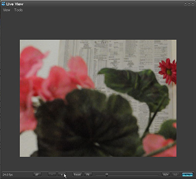 When the Live View panel opens, it will show what the camera is currently seeing. Within the Live View panel, you can repeatedly press the + button to zoom in on center of the indicated rectangle, press the - button to zoom out, or press the Reset button to zoom all the way out in one click. When the panel is zoomed all the way out so that the rectangle is showing, you can double-click within the image to set a new center for the rectangle.